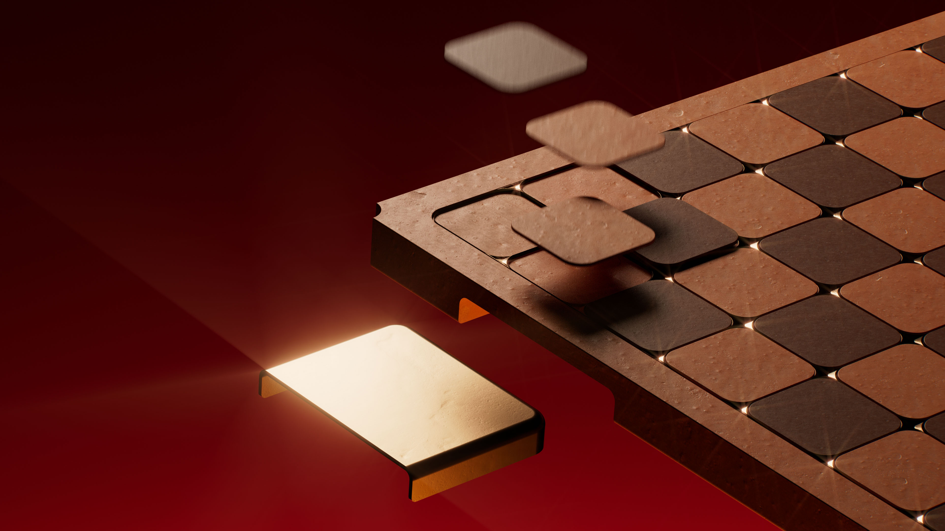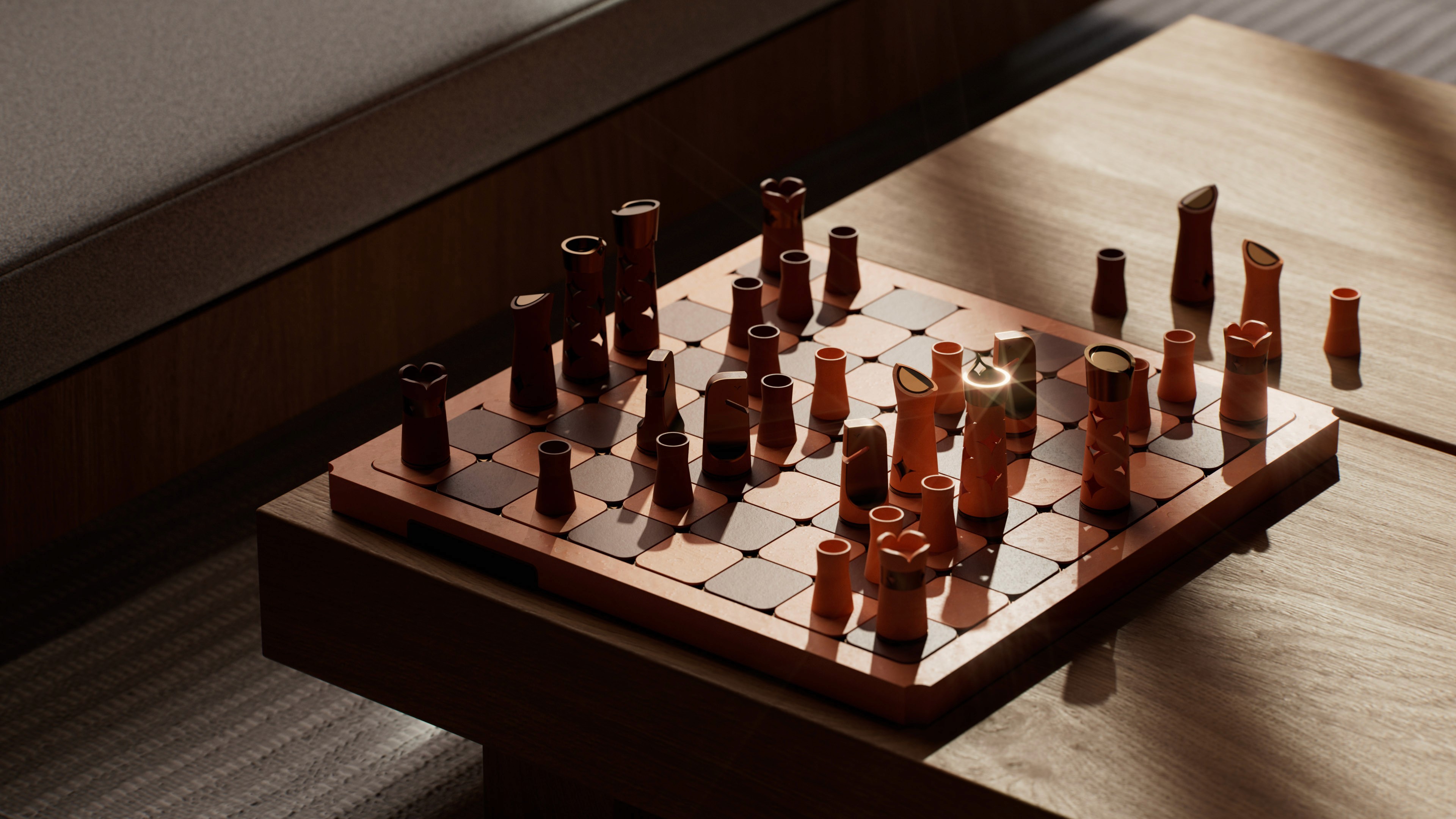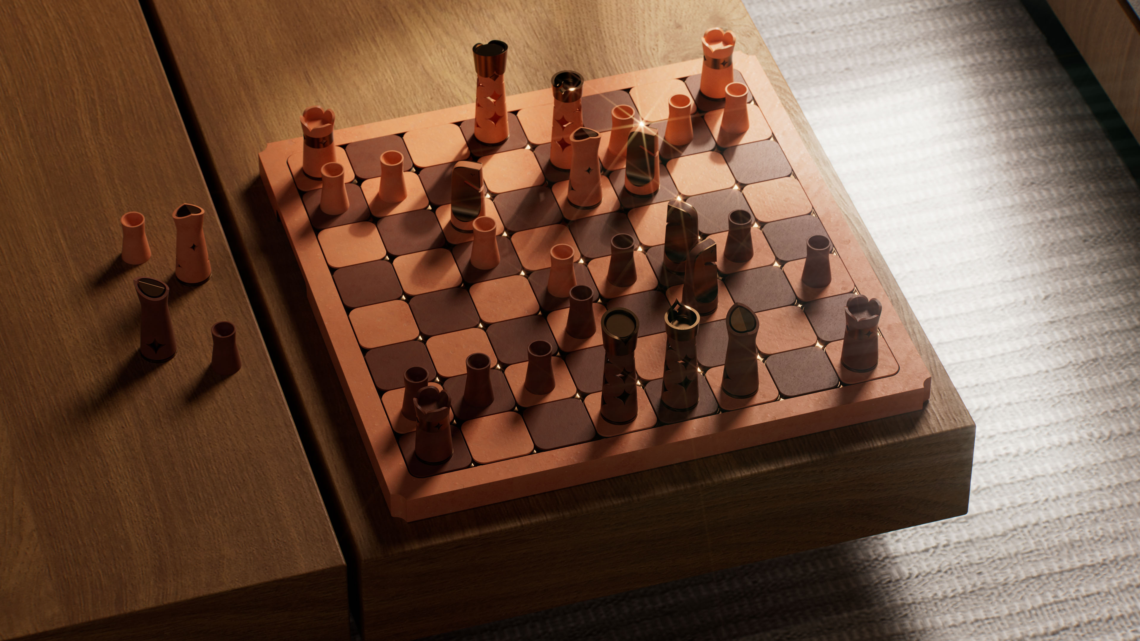 At the heart of the board lies a system of sunken bronze stars embedded within each square. These are not decorative inserts, but tactile markers that introduce depth, rhythm, and orientation. As light moves across the surface, the stars catch and release highlights, allowing the board to transform subtly throughout the day.