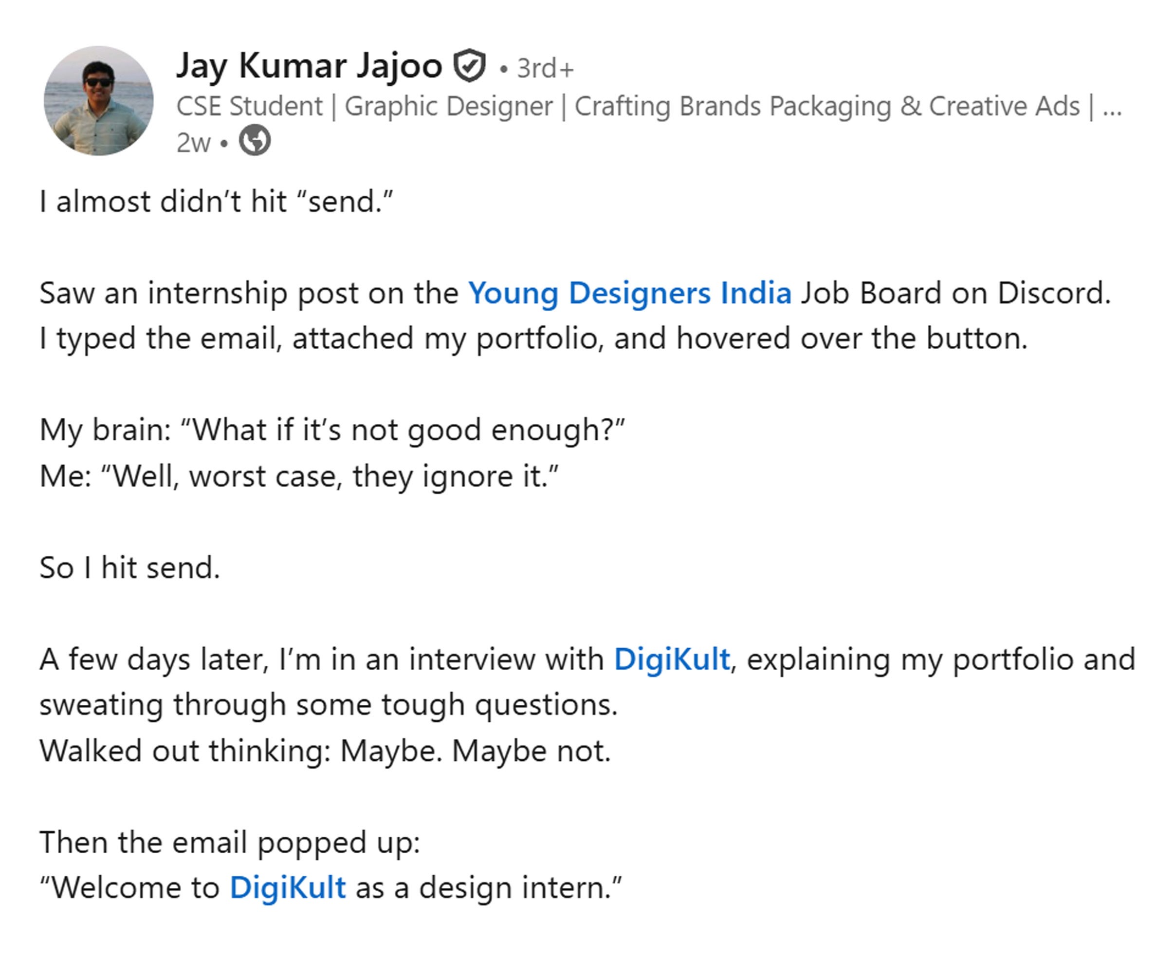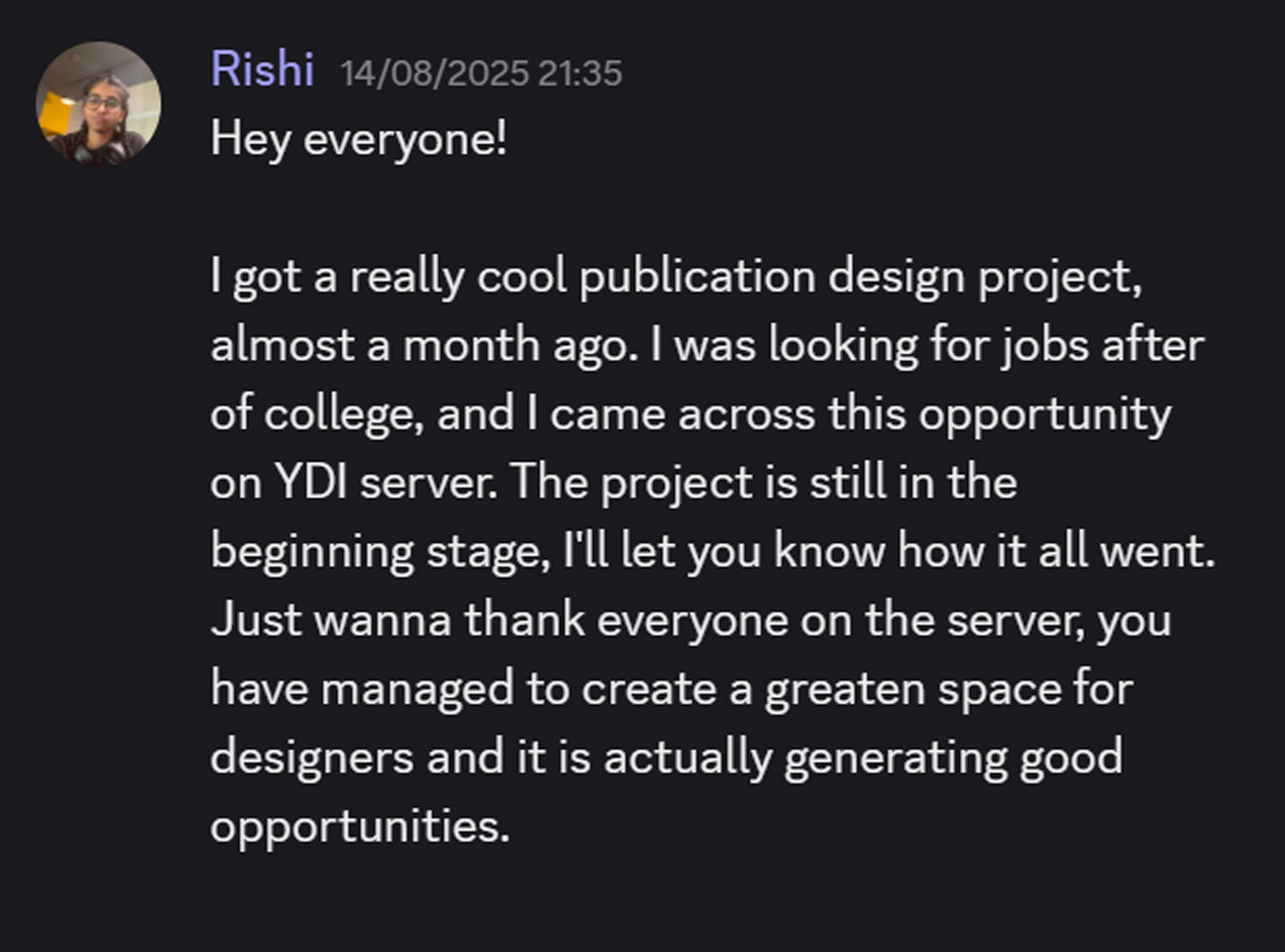 "Having found YDI has to be a blessing to me! For someone striving to make a place for herself in this competitive industrial world, it gives me immense happiness and hope when I see job updates coming in a pipeline! Keep going YDI, we designers need people like you!🤝🏻"