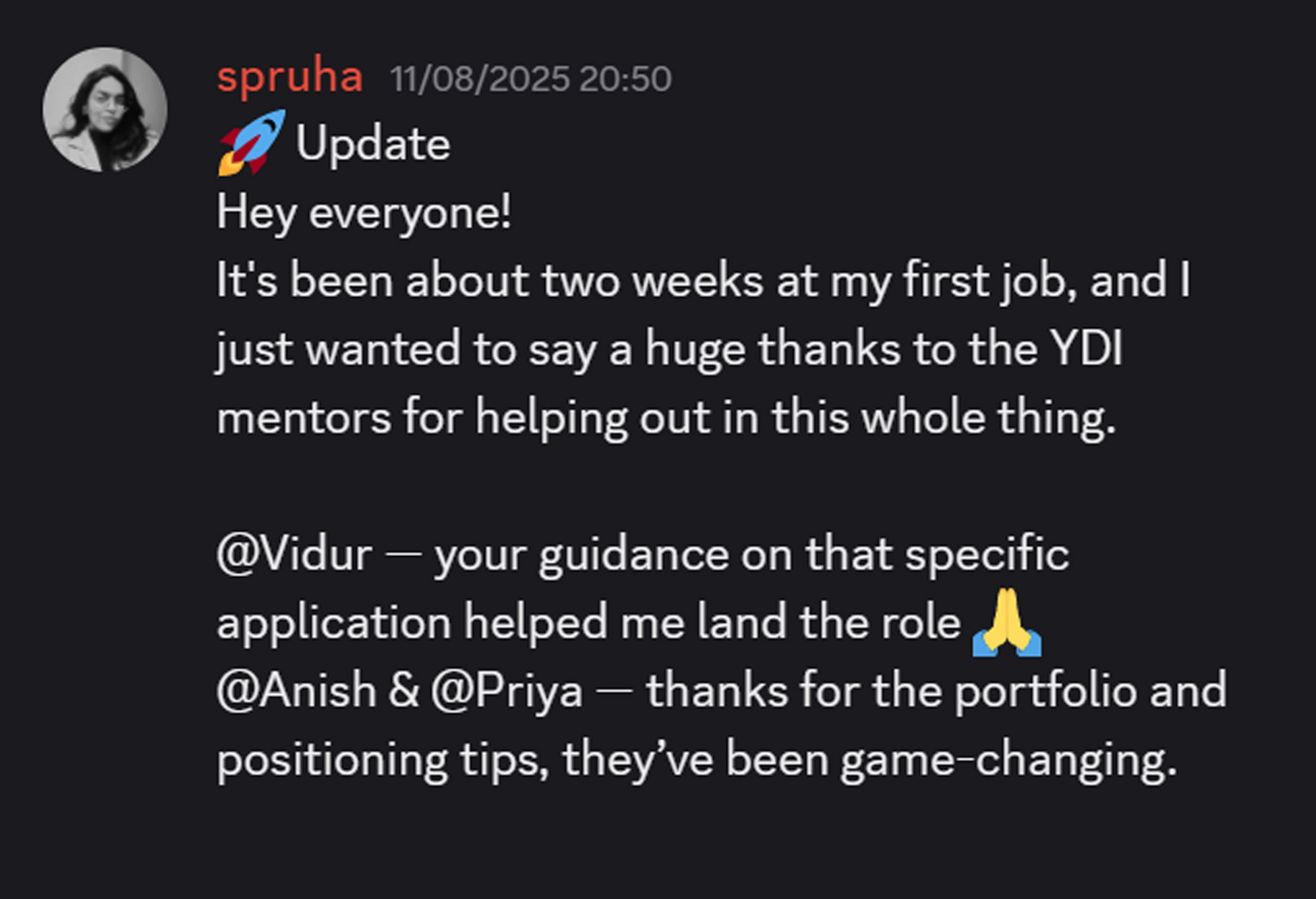 "I've been part of this community for more than 2 years, and my experience with YDI has been the best. It's a highly supportive and helpful community that has provided me with valuable insights and resources. Especially discord server is very much useful. I find it incredibly useful and would recommend it to anyone looking for guidance and growth."